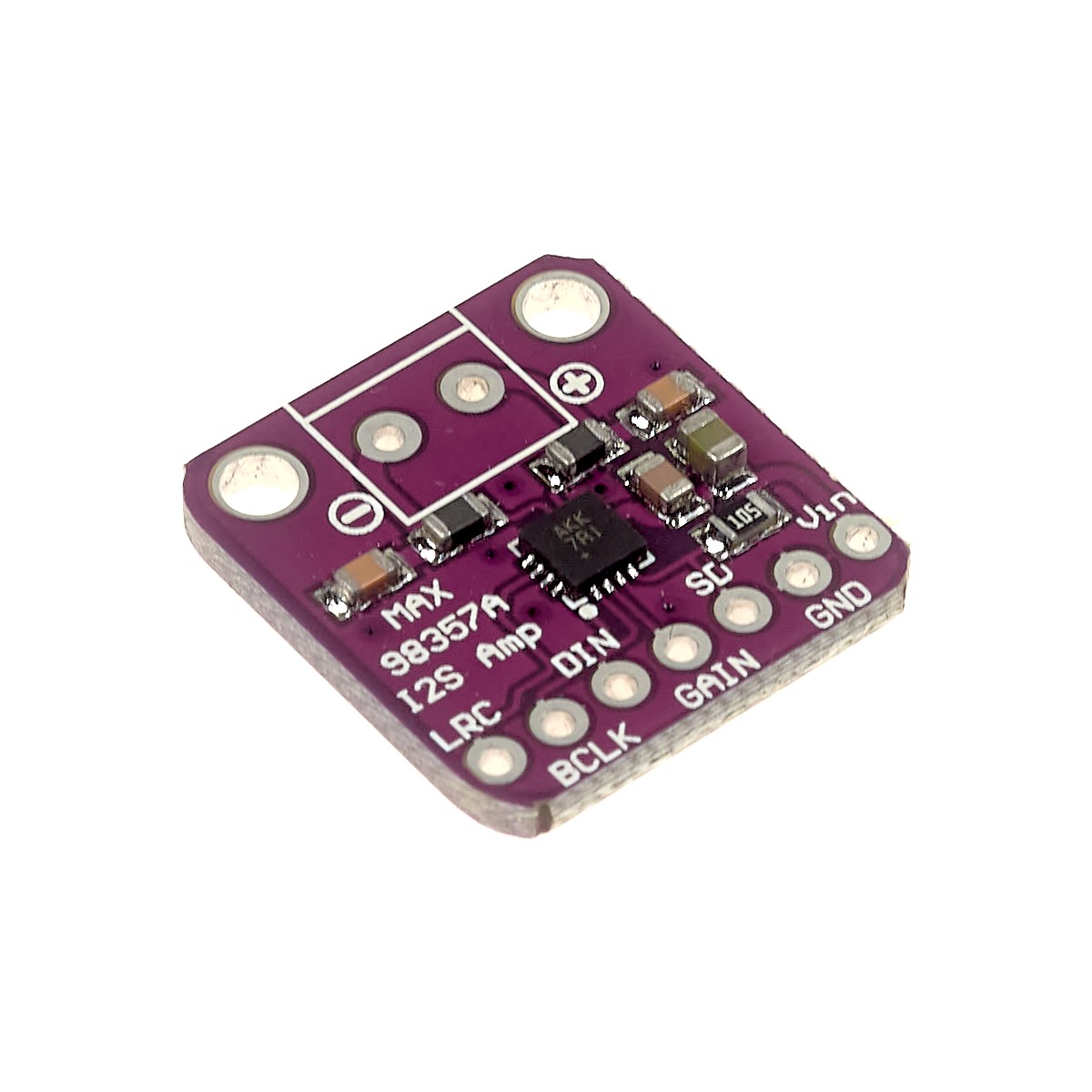 El MAX98357 es un amplificador clase D con entrada I2S, el Chip incorpora un DAC con decodificador de modulación de código de pulso digital (PCM) y un amplificador clase D con salida PWM con potencia para controlar un parlante de 4ohms o más.