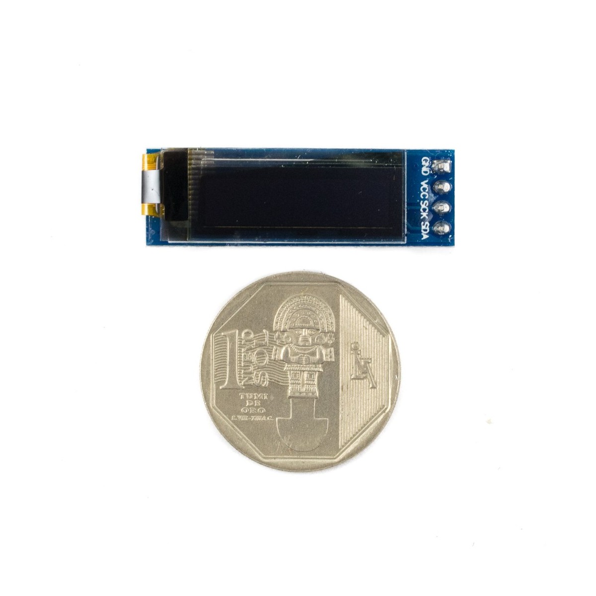 Pequeña pantalla OLED de 128*32 píxeles, ideal para aplicaciones portátiles donde se requiere un mínimo tamaño y bajo consumo de energía. Texto color Blanco.