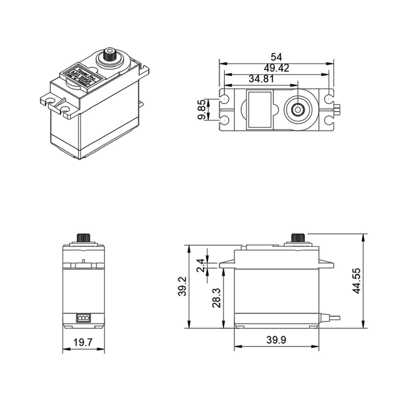 Servomotor estándar de propósito general y torque medio. Puede rotar aproximadamente 180 grados (90° en cada dirección). Tiene la facilidad de poder trabajar con diversidad de plataformas de desarrollo como Arduino, PICs, Raspberry Pi, o en general a cualquier microcontrolador. Utilizado para ala fija de avión, coche rc, robótica.